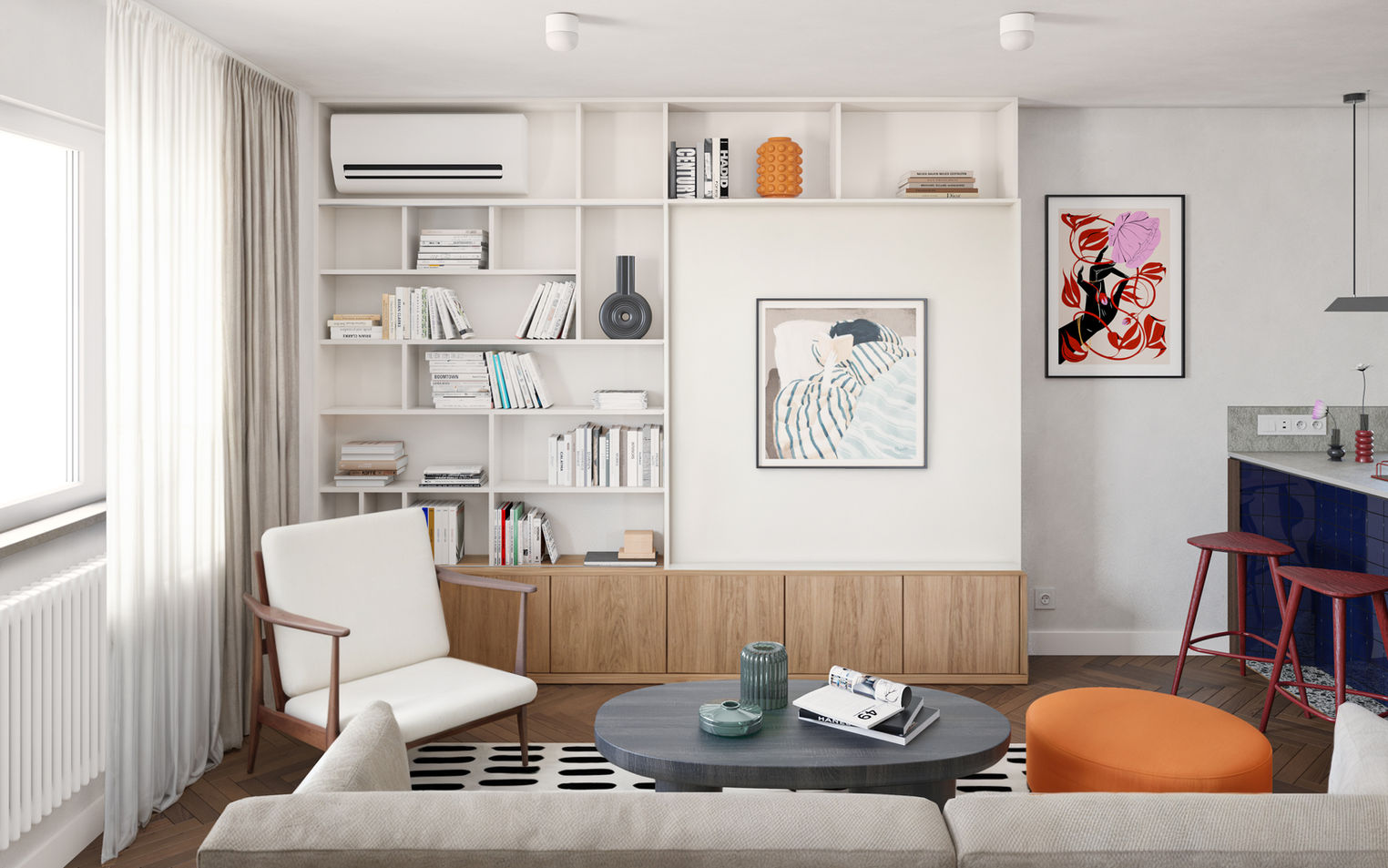 W salonie znajduje się zaprojektowany na wymiar mebel, z ruchomym frontem, za którym ukryto telewizor. Meble w salonie są nowoczesne, ale z PRL-owskim akcentem w postaci fotela. Strefę dzienną wzbogacają dodatki, takie jak na przykład pomarańczowa duża pufa.